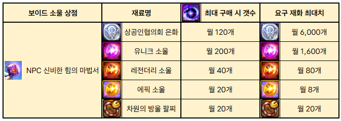 <표 1> 보이드 소울 상점