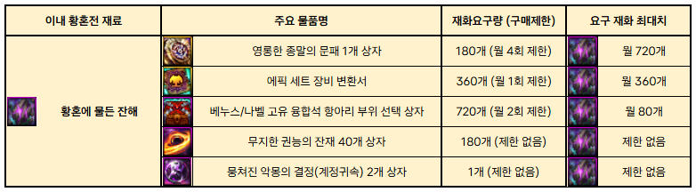 <표 4>는 이내 황혼전 보상인 '황혼에 물든 잔해'로 구매할 수 있는 품목의 일부를 나열한 것입니다.