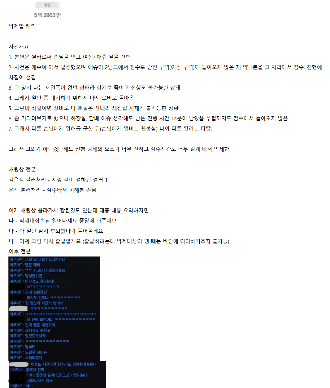 그리고 팅기고 바로 복귀해서 죄송하다고 말했고 다른사람들이 자기한테 호의적이지않은 댓글을 달면 도배하고 해당글을 신고해서 접근불가 상태로 만들고