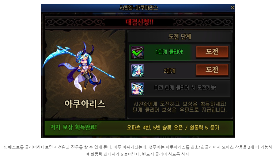 아래 아이템을 착용하시되 , 한쪽 슬롯 강화만 하셔도 되니 필수적으로 챙기셔서 쉽게 사천왕을 잡아주세요.