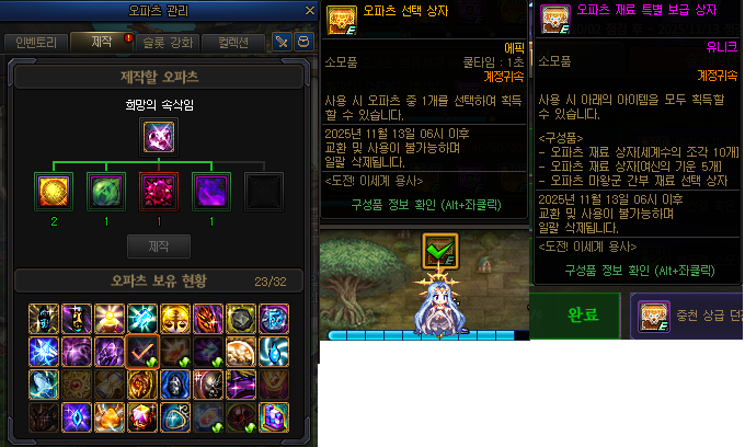 왼쪽의 확정이나 오른쪽의 랜덤을 굴려서 오파츠 레서피 받기