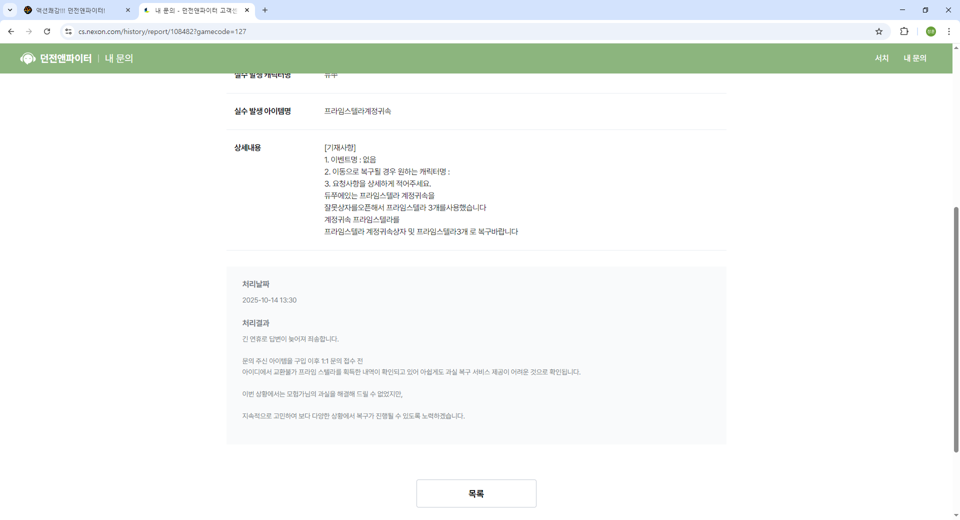 공지 [수상자 발표] [월드보스] 정보/공략 작성 이벤트 수상자 안내 던전앤파이터 2025.12.04 1,599 0 공지 [이벤트] [디레지에] 레이드 정보/공략 작성 이벤트 던전앤파이터 2025.11.26 5,764 0 공지 2025 던파페스티벌 20th Anniversary 발표 요약 던전앤파이터 2025.11.22 80,614 21 공지 [상시이벤트] 11월 묻고답하기 이벤트 안내 (10월 답변왕 발표) (8) 던전앤파이터 2025.11.06 36,702 1 공지 장비 / 플레이 / 뉴비 정보 모음 (217) 던전앤파이터 2025.04.24 999,999+ 115 공지 던전 공략 모음 (디레지에 레이드) (174) 던전앤파이터 2025.11.26 999,999+ 138 공지 전직 별 가이드 모음 (25/11/24 갱신) (742) 던전앤파이터 2025.11.24 999,999+ 389 토론 [공통] 종민형 조련실력이 상당하시네요. (디레지에 레이드 얘기) (6) 하얀털올리 2025.12.07 297 0 토론 [공통] 최근 지인사칭 피싱사기로 피해보신 분들을 제보받습니다. (6) 명속뇌신 2025.12.07 277 0 토론 [팔라딘] 팔라딘 백스탭 삭제좀 해주세요 합격찹쌀떡 2025.12.06 234 0 토론 [공통] 디레 다음 사도레이드는 누구 예상하시나요? (3) 폭핵몬스터 2025.12.06 380 0 토론 [다크나이트] 가격 임시dnf118891120 2025.12.06 178 0 토론 [데몬슬레이어] 스토리 죽일꺼신지 살려둘건지 선택있으면좋겠네요 (6) 끝내주는데몬 2025.12.06 215 2 토론 [다크 랜서] 카인섭 캐릭닉넴 린이는소환중 모험단이름 Linyi 다들 차단박고 클린겜하세요 여름빛클로버 2025.12.05 183 0 토론 [남크루세이더] 꼬홀 부활은 왜 패치 가 없나요..?? (7) 자몽에이드~ 2025.12.05 1,032 1 토론 [공통] 디레지에 TOP20 공대원or공대 구합니다. (5) 쿠노OwO 2025.12.05 342 0 토론 [여스트라이커] 프라임 스텔라 (2) 넨마딴지 2025.12.05 265 0 토론 [인챈트리스] 븝퍼 금저 채널링은 왜 안없애주냐아 태오몽 2025.12.04 245 0 토론 [웨펀마스터] 랜덤 변환권이 그대로 나오는게 충격이네 (1) {眞}검1신 2025.12.04 542 1 토론 [공통] 여러분 만약에 레이드 종숭이 보상이 (2) 별빛미시안 2025.12.03 338 0 토론 [남스핏파이어] 웨펀 무기 마스터리봐줬으니 (3) 쏠히군 2025.12.03 326 0 토론 [공통] [모집] 안녕하세요. ▲ " 소중길드 " ▲ 에서 함께하실 분들 모집합니다. (50) 소사동 2025.12.03 119,053 3 토론 [공통] NPC 호감도 시스템 관련하여 건의드립니다 40409 2025.12.03 263 1 토론 [공통] 언젠가 4차 각성이 나올 거라고 예상하시나요? (1) [Lilith] 2025.12.01 386 0 토론 [공통] 바칼 모험단 읽씹님 드디어 답변 받았어요. (5) 솔류션입실론 2025.12.01 395 0 토론 [사령술사] 태별 뽑은죄 아처 안키운죄 (2) 미키엘르 2025.12.01 509 0 토론 [웨펀마스터] 디레지에 연기합시다... (4) 조선 2025.12.01 970 0