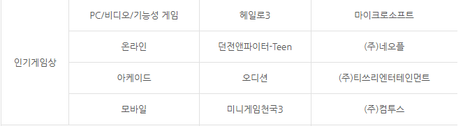 그리고 오늘 자료를 찾아본 결과 던전앤파이터도 수상을 한 내역이 있었는데요. 바로 2007년 게임대상에서 인기게임상으로 수상을 한 내역이 있습니다.
