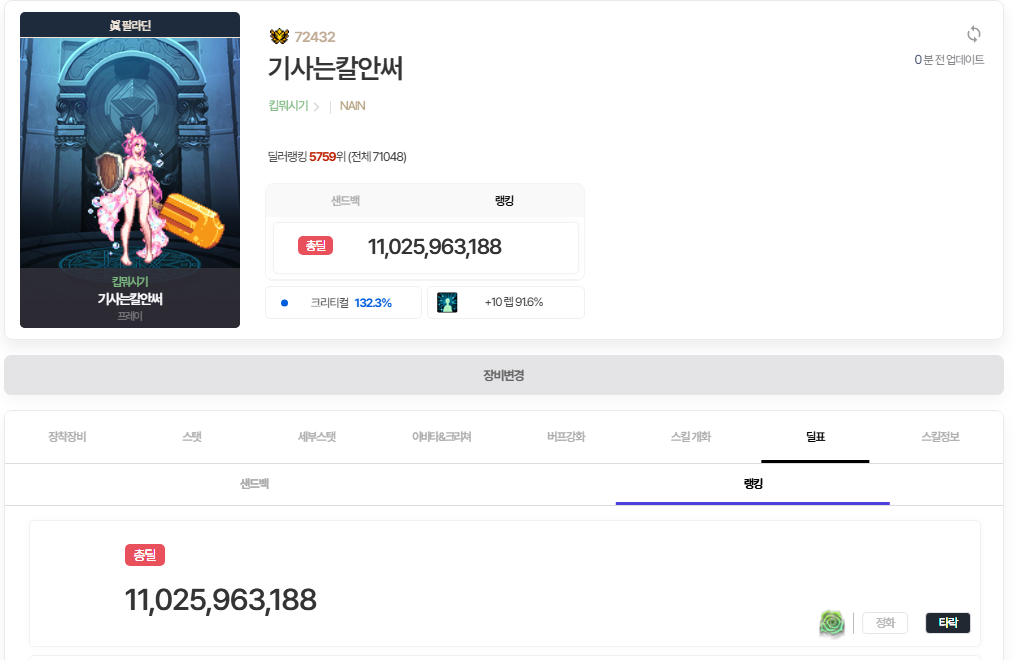마부 어디를 손보는게 가장 효율 좋을까 보는데 던담 반영이 늦어서 갱신이 안됬었네... 110억이네요