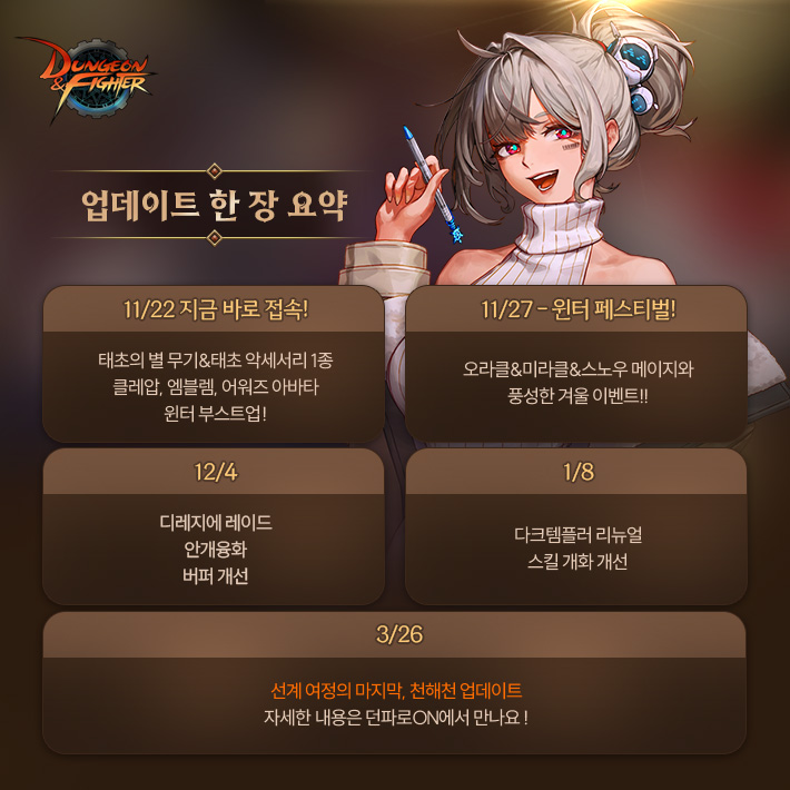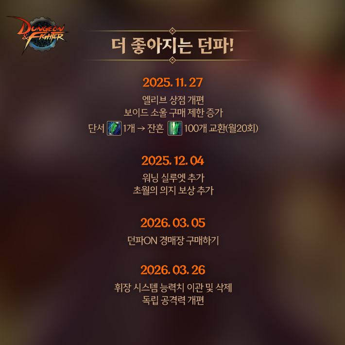 공지 [수상자 발표] [월드보스] 정보/공략 작성 이벤트 수상자 안내 던전앤파이터 2025.12.04 758 0 공지 [이벤트] [디레지에] 레이드 정보/공략 작성 이벤트 던전앤파이터 2025.11.26 4,997 0 공지 2025 던파페스티벌 20th Anniversary 발표 요약 던전앤파이터 2025.11.22 79,668 20 공지 [상시이벤트] 11월 묻고답하기 이벤트 안내 (10월 답변왕 발표) (8) 던전앤파이터 2025.11.06 36,262 1 공지 장비 / 플레이 / 뉴비 정보 모음 (217) 던전앤파이터 2025.04.24 999,999+ 115 공지 던전 공략 모음 (디레지에 레이드) (172) 던전앤파이터 2025.11.26 999,999+ 137 공지 전직 별 가이드 모음 (25/11/24 갱신) (739) 던전앤파이터 2025.11.24 999,999+ 389 수다 [여크루세이더] 이번에 버프가 개편 되었는데 옥에티같은것 한가지만 말씀드립니다. 와니수라3 15:11 3 0 질문 [웨펀마스터] 이거 확률상 가능한 이야기인가요? (2) 림신 15:01 66 0 질문 [공통] 에픽초돌없이 초월하려면 (2) 정다한 15:00 56 0 토론 [남크루세이더] 꼬홀 부활은 왜 패치 가 없나요..?? (7) 자몽에이드~ 14:45 722 1 수다 [공통] [루바토&레가토&테누토&바이엘] 나벨 혼자가기 외롭다? 이내도 혼자가기 무섭다? 뉴비길드도 있다구 헤딩팟어때? (7) 칸나의노예 14:43 13,507 2 질문 [듀얼리스트] 용투vs금향 어떤 세팅이 괜찮을까요? (5) 우리집소마 14:33 122 0 수다 [공통] 디레 어제 10트해보고 난 소감 (8) 무영흑단장 14:31 229 0 수다 [공통] 돈벌기쉽따~ (1) 스트라이커남 14:31 172 1 수다 [공통] 신생길드! ''헐!'' 고인길드 녹아들기 힘드신분들!! /말 많으신 분,활발하신 분 대환영 냥담배 14:28 12,836 1 수다 [공통] [오픈카톡방] 뉴비&던붕이 필수 오픈톡방! 초쿠의 던전앤파이터 수다&정보방 정상 영업 중! (32) 초코쿠키핌 14:21 92,023 8 수다 [공통] [모집] 추운 겨울...마음이 따듯해지는 훈훈한 카톡 보고가시겠어요...? <개꿀잼 오픈톡 맛보기 공개> (488) 싑고수 14:21 277,534 26 수다 [공통] ㅇㅅㅇ (6) 개골개골 14:16 109 1 팁 [남크루세이더] 1000% 주관적이고 개인적인 버프 위주의 호리 팁(2025.12.05 수정) (20) 캔슬하슈 14:15 116,682 11 수다 [공통] 연합길드[멜로디]에서 길드원 모집중!!나벨,이내,디레지에 길공운영중!!(디레 1트클 성공!!)뉴비길드운영!!가입신청 레쓰븜!! (12) 시어하트어택 14:15 18,591 1 수다 [남크루세이더] 영축에 솔플 스증 생겼구나 캔슬하슈 14:11 106 0 팁 [공통] #디레지에 1페이즈 공략_한 줄 요약까지 첨부 (완벽대응 완료) (41) 도널드트럼프 14:10 15,654 35 수다 [공통] [정상영업 합니다]환영합니다! 저흰 소금빵입니다. 함꼐 놀며 편하게 지내실 뉴비/복귀/던짱 길드원 절찬리 모집중입니다! 드나땅! 14:06 10,775 3 질문 [공통] 디레지에 레이드 이거 진짜에요?? (1) 임시dnf204044738 13:55 344 0 질문 [공통] 1인길드 만드는거 도와주실분 계신가요~!! 건전한검신 13:52 84 0 수다 [공통] 성인 친목 길드 윤곽에서 오랫동안 같이 하실 분 모셔요! (11) 톳치 13:48 74,984 11