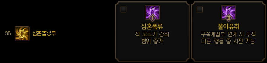 2. 흔히 텐가이라고 불리는 마혼제령술 스킬M와 30제 스킬인 공력의 구보단 35제 심혼흡성부의 스킬데미지가 더 썌기때문에 채용합니다. 이 스킬을 사용하려면, 75제 마혼합일을 채용하여 사용합니다.