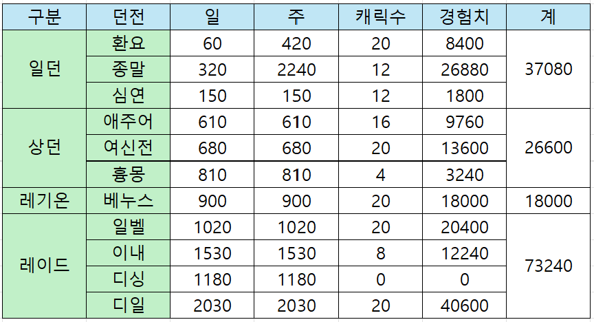 일단 첫 주차 목금토 디레지에 레이드를 제외하고 일던은 절반정도만 했다고 가정하에 20캐릭 숙제를 끝낸 기준으로