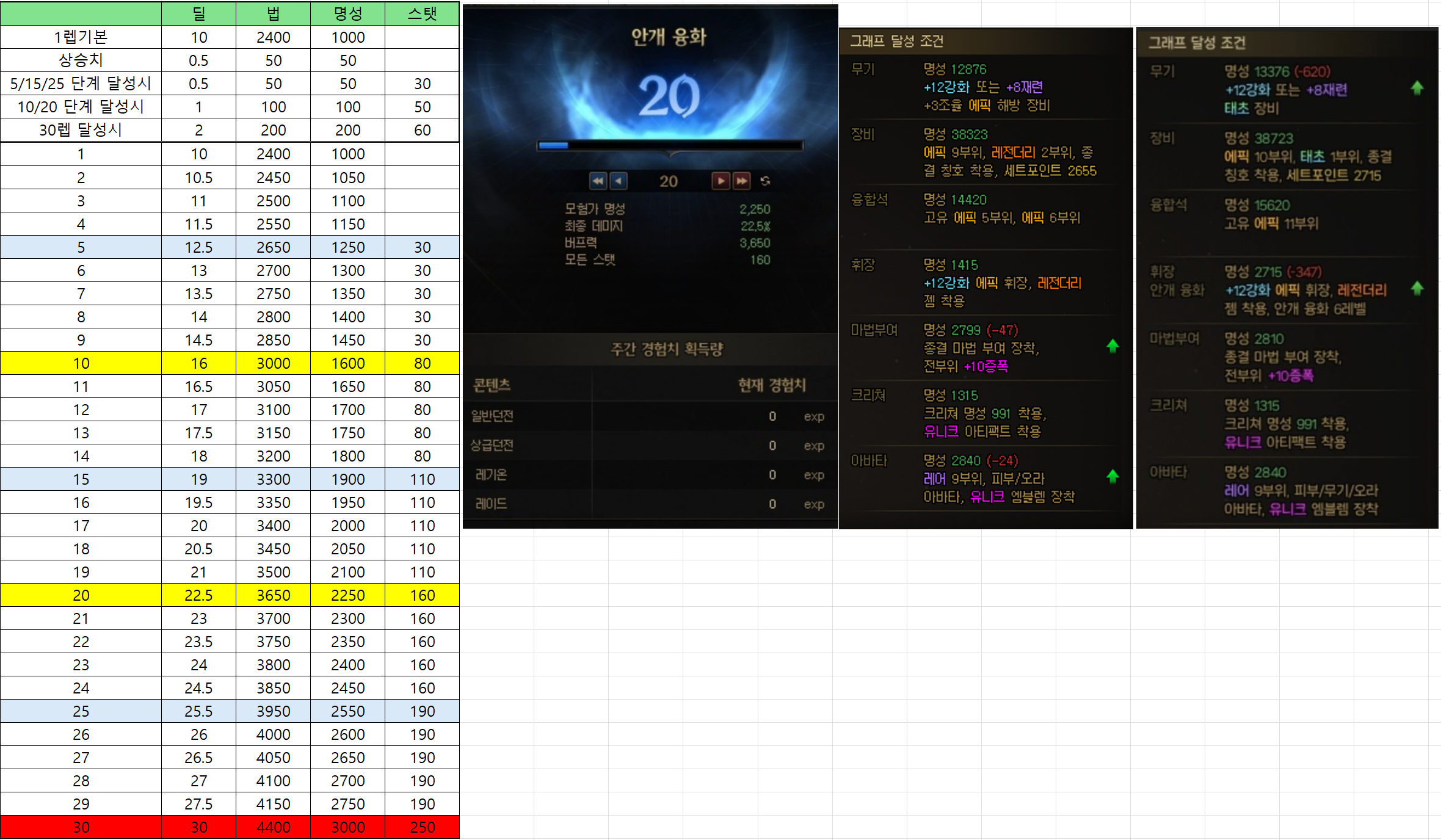 - 싱글로만 20캐릭 보낸경우 48840+1480점으로 주간 최대 경험치 습득은 110390 정도로 MAX치와 3400점 정도의 차이밖에 없다