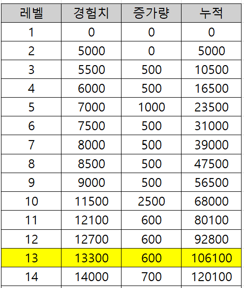 - 설마 5레벨 부터 막 2배씩 뛰고 그러진 않겠지??