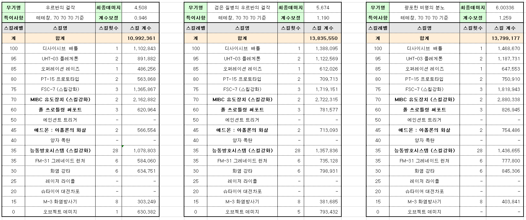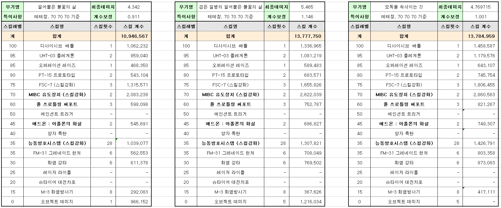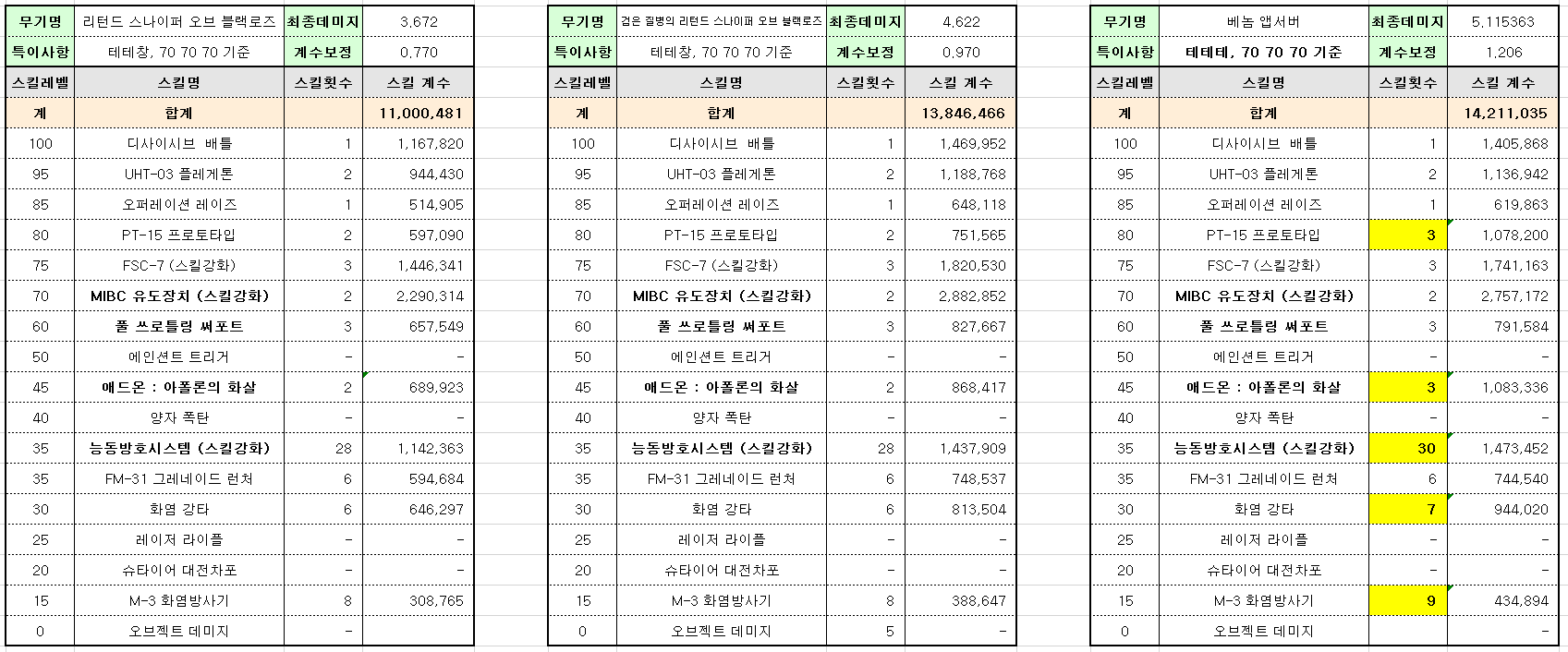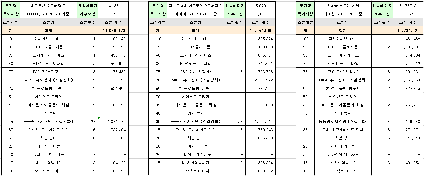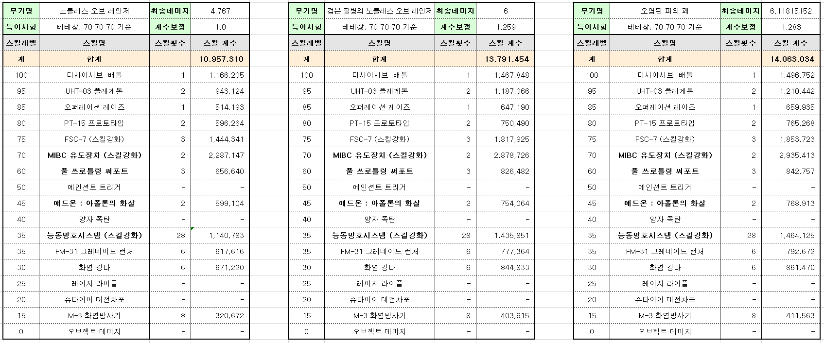 3. 무기 및 방어구 최종 업그레이드 시 데미지 상승량 (깡딜 무기로 비교시)