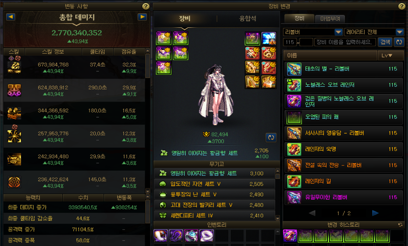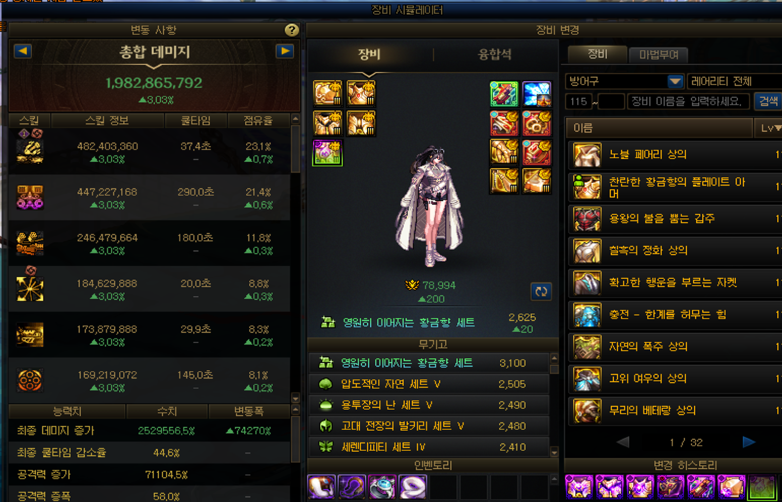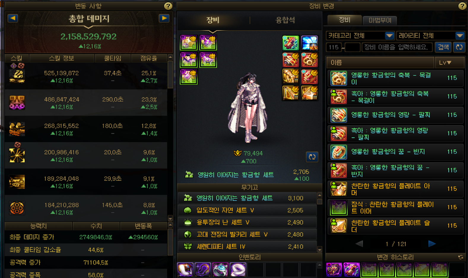 - 마지막으로 방어구 5부위를 다 올리게 되면 포인트 2,705 = 2,550 + 155로 최종데미지는 2% 추가로 오르게 된다. 따라서 최종 데미지 상승량은 1.098*1.02 ≒ 12% 정도의 상승량을 가진다.