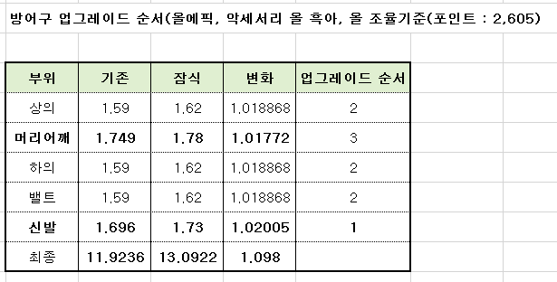 - 부위 별로 최종 데미지 차이가 약간 발생하므로 0.1%의 격차가 조금씩 발생하는데, 위의 표를 참고하여 업그레이드 순서는 신발 > (상의, 하의, 밸트) > 머리어깨 순서로 하면 되겠다.