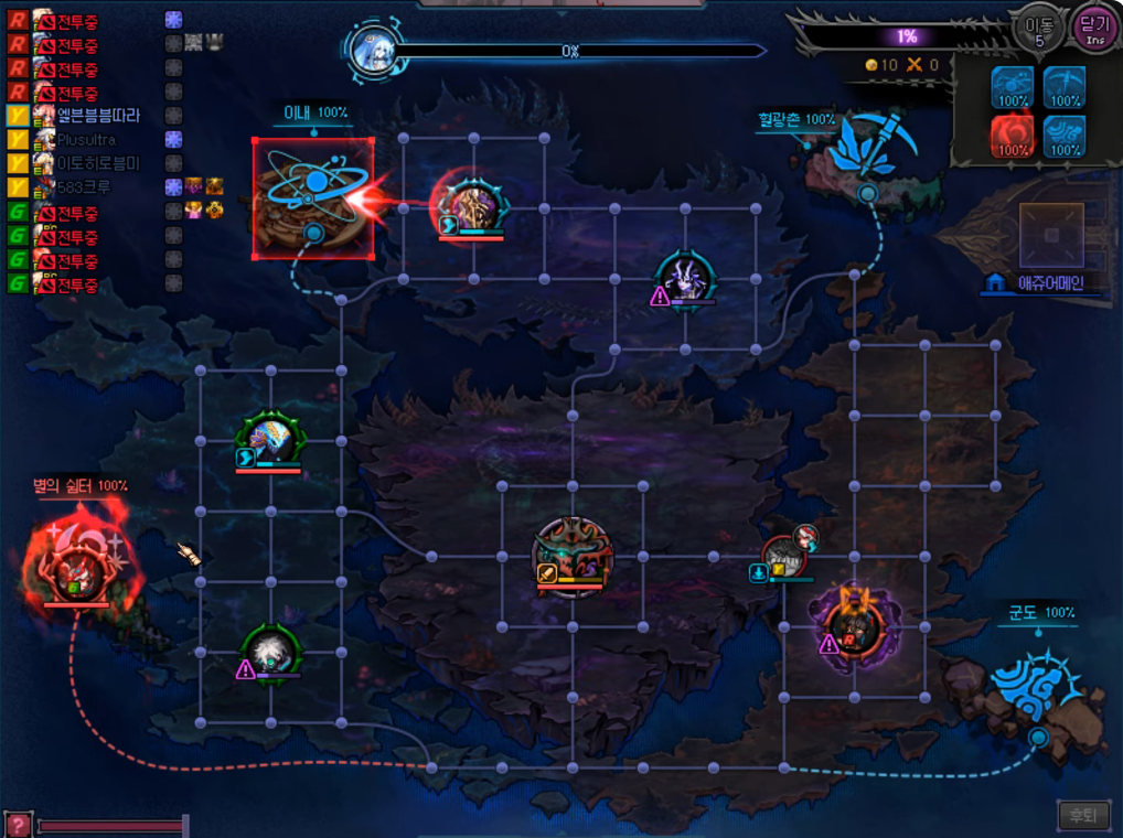 - - - - - 점 선으로 공격 당하고 있는 거점, 혹은 [하수인]의 침입 루트를 보여줍니다.
