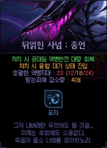 - 종언의 굴레가 발동되면 X 버튼 사인이 뜨는데, 이를 눌러줘야 맵 반대편으로 이동 되며 보스의 공격을 회피.