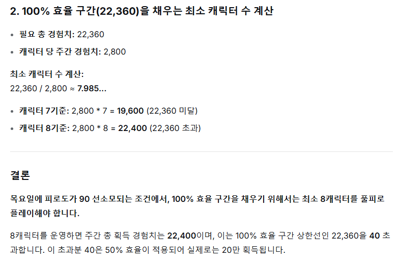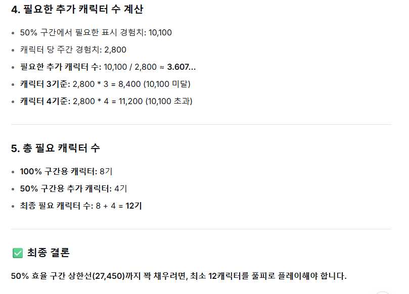 1차 효율 감소 구간 (50%) 구간 전부 채우려면 : 12캐릭