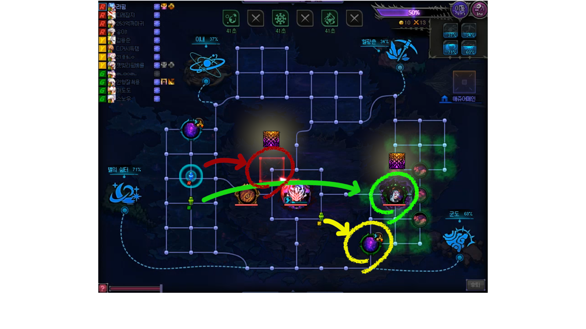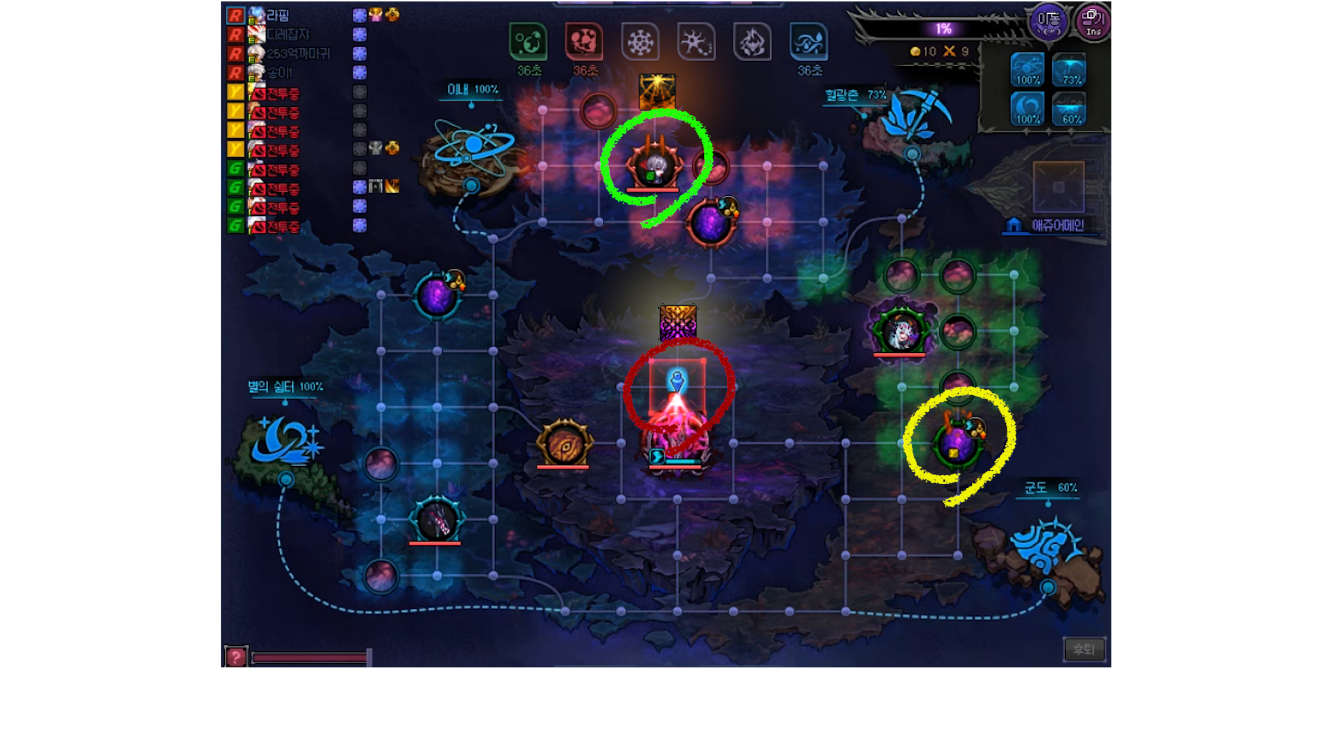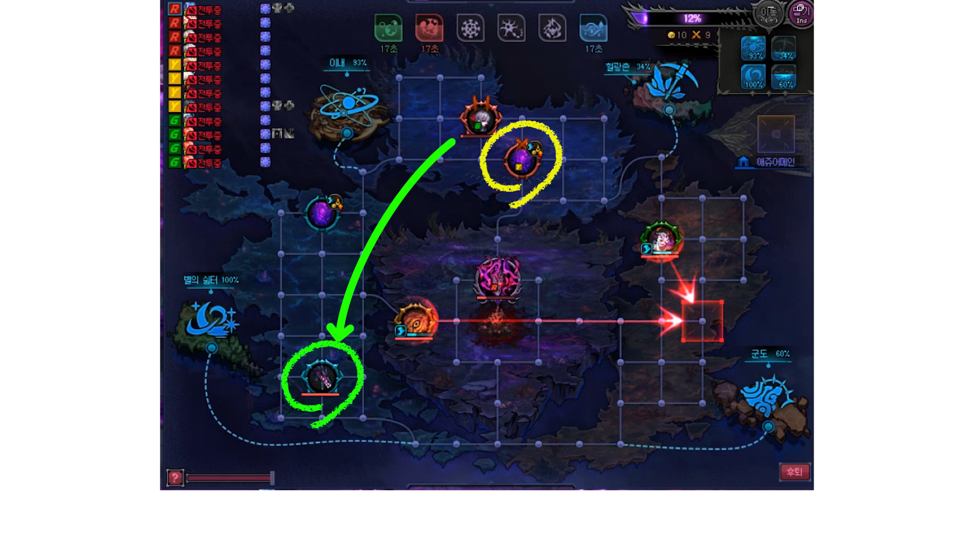 옐로 : 3시 씨앗 입장 (격돌 유도, 포 오는대로 + 탭 남아있으면 탭 활용) -> 12시 씨앗 입장(탭 2회 사용)