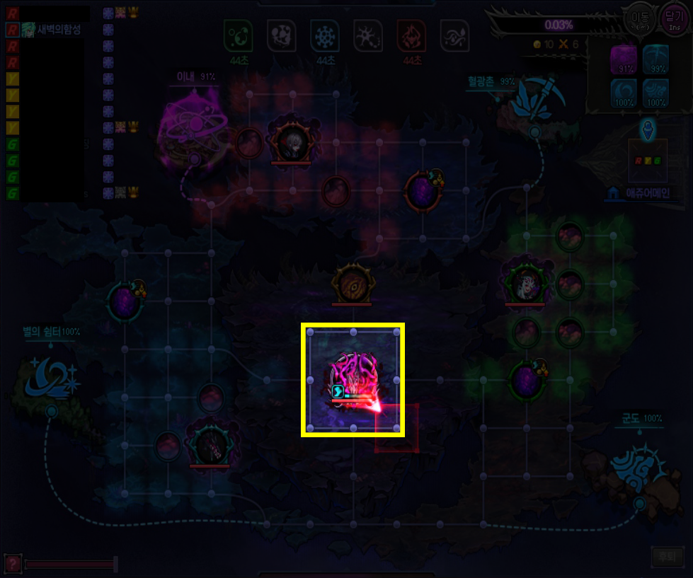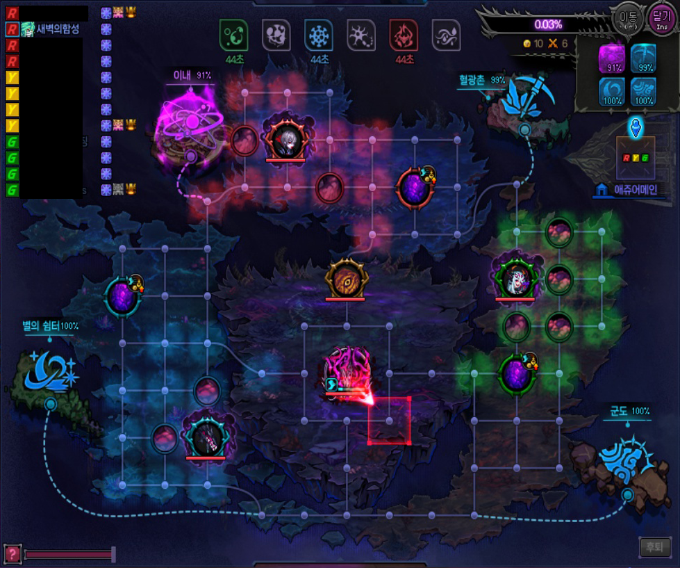 각 영역의 뒤얽힌 사념은 '역병지대'(붉은색 구름모양)을 생성하고, 역병지대는 자신을 중심으로 3x3 영역에 오염지대를 생성합니다.