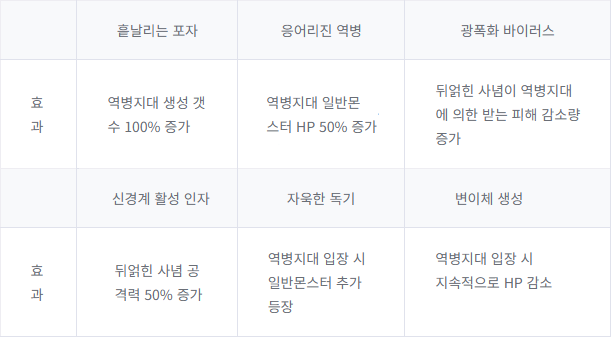 특히나 '흩날리는 포자' 는 역병지대의 생성 갯수를 2배로 늘리기 때문에, 거점이 오염지대에 공격받기 쉬워지기 때문에 최우선으로 처리하는게 좋습니다.