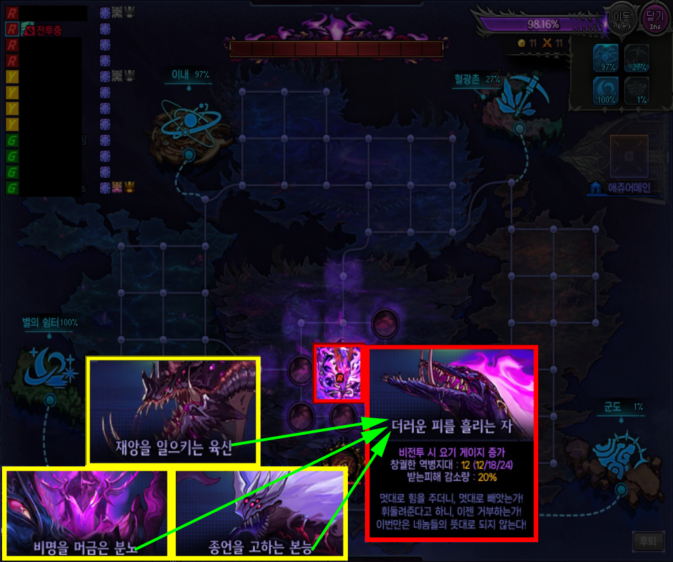 2페이즈 시작시 3종의 뒤얽힌 사념들은 각자 고유의 '역병효과'를 보유하고 있고, 그에 따라 능력이 강화됩니다.