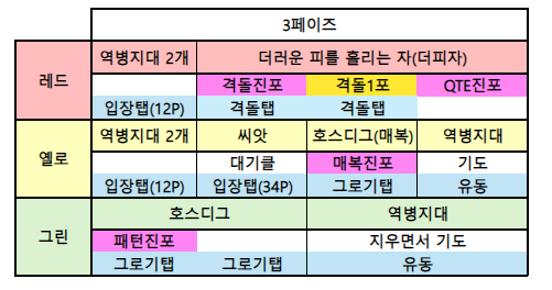 옐로는 역병지대 2개 정리 -> 호스디그 입장 -> 패턴파훼 후 패턴그로기 진포 + 그로기탭(역병지대 생각해서 1명은 남기기) -> 무력화 안 보고 바로 교대