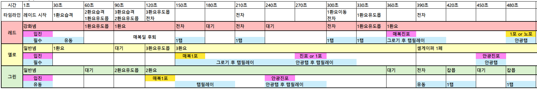 레드 선입장 - 입진(1234탭릴레이) -> 씨앗 잡히면 리필탭(234) -> 무력화딜 -> 안광1탭 후 1포(포 없으면 그냥 딜) -> 사념 잡히면 리필탭(1234) -> 옐로 교대