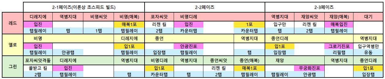 레드는 포자씨앗을 2탭 릴레이로 밀고 역병지대 리젠 + 옐그 탭 털면 격돌 -> 포돌면 디레 교대(입진 + 카운터탭) -> 1포로 밀기