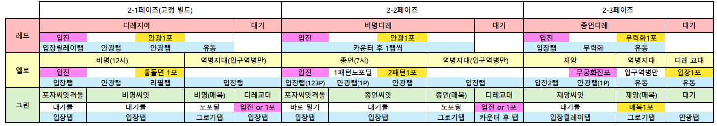 옐로는 비명 입진 + 탭릴레이 -> 나오면 대기하다가 그린 후퇴하면 디레 입장 -> 입1포 + 탭릴레이로 디레 마무리