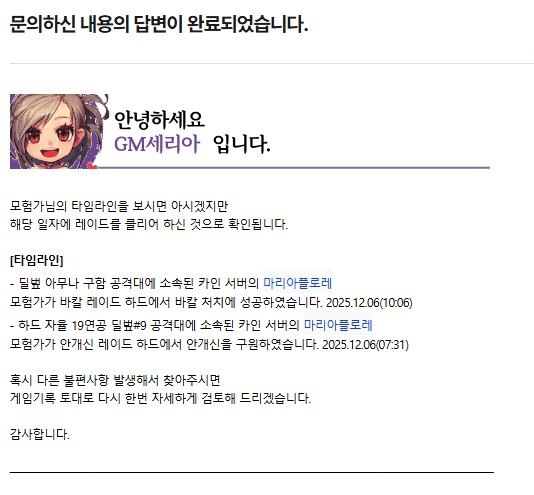 이날 캐릭터 명성이 실시간 변경이 되어서 1:1문의를 하게 되었는데