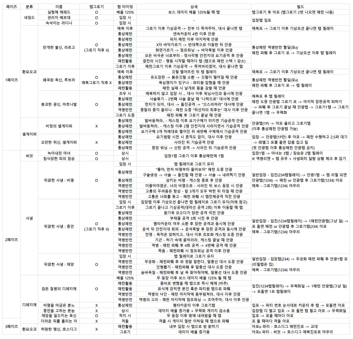 공지 [상시이벤트] 12월 묻고답하기 이벤트 안내 (11월 답변왕 발표) (10) 던전앤파이터 2025.12.11 1,220 0 공지 [수상자 발표] [월드보스] 정보/공략 작성 이벤트 수상자 안내 던전앤파이터 2025.12.04 2,471 0 공지 [이벤트] [디레지에] 레이드 정보/공략 작성 이벤트 던전앤파이터 2025.11.26 6,597 0 공지 2025 던파페스티벌 20th Anniversary 발표 요약 던전앤파이터 2025.11.22 81,759 21 공지 장비 / 플레이 / 뉴비 정보 모음 (218) 던전앤파이터 2025.04.24 999,999+ 115 공지 던전 공략 모음 (디레지에 레이드) (176) 던전앤파이터 2025.11.26 999,999+ 138 공지 전직 별 가이드 모음 (25/11/24 갱신) (743) 던전앤파이터 2025.11.24 999,999+ 389 팁 [공통] [흉몽]신규 던전 '해방된 흉몽'의 2번째 보스, [급습자 제르미오] 패턴 공략 (3) 데스빌리안 2025.12.12 48,764 10 팁 [공통] [디레지에]TTS로 보는 디레지에 레이드 공략 영상 (3) 히카리타마 2025.12.12 1,184 6 팁 [엘븐나이트] [11/6 밸패 반영]엘븐조아 엘븐나이트 간단 공략 (36) 체인조아 2025.12.12 116,045 44 팁 [공통] 디레지에 레이드 컨닝페이퍼 (21) 퀵드로우 2025.12.11 1,175 12 팁 [여크루세이더] 여크루세이더 가이드 12/10 (724) 에반쩰리스트 2025.12.11 696,946 404 팁 [공통] 디레지에 파티장/공대장용 2페이즈 역병지대(일명 똥) 관리 요령 원본 2025.12.11 455 2 팁 [공통] [디레지에] 디레지에 레이드 시스템 안내서 (1페이즈) (20) 새벽의함성 2025.12.11 3,952 15 팁 [공통] 중천시즌 최종단계 마법부여 정리 (260) 퀸붐 2025.12.10 298,837 253 팁 [여스트라이커] 타격감 손맛 쾌감! 여 스트라이커 가이드 백서 - 중천 v6 : 디레지에 레이드(추가 완료) (436) 백랑월 2025.12.10 742,128 167 팁 [공통] 라이브 서버 기준] 디레지에 레드가 멱살잡고 깨주는 빌드 컨닝 페이퍼 + 역병 반전 타이밍 핵심만 알아보기 (8) 말랑무제비 2025.12.10 812 5 팁 [공통] [디레지에] 디레지에 레이드 시스템 안내서 (2페이즈) (7) 새벽의함성 2025.12.10 3,012 6 팁 [버서커] 세상에 나쁜 버또는 없다. MZ버서커 올바르게 키우기(스킬 밸패 추가) (77) 커피 2025.12.10 132,957 47 팁 [공통] 디레지에 공략을 해보자 (마음껏 퍼가시고 모두 레이드 성공하자 아자아자.) (29) 애니래온하트 2025.12.10 17,291 20 팁 [공통] 디레 애매한 버퍼 빼는 꿀팁 (6) 븝미에몽 2025.12.10 709 2 팁 [공통] [디레지에]레이드 실전압축공략+본섭맛 추가 (5) 실력그래프 2025.12.10 3,898 10 팁 [공통] [디레지에]탭만 잘해도 쉽다? 디레지에 레이드 탭(역병 반전) 공략 보배단 2025.12.10 459 1 팁 [공통] [디레지에] 180/570~590 OR 200/560 저스펙 빌드 2페이즈 ( 12시 OR 7시가 포자 디버프인 경우) (1) 멜론팥크림빵 2025.12.09 401 0 팁 [소드마스터] 중천 '도' 소드마스터 공략과 캔슬 가이드! (움짤다수) (2025.12.09 갱신) (137) 유키노 2025.12.09 98,294 40 팁 [공통] [디레지에]180/570~590 OR 200/560 저스펙 빌드 2페이즈 ( 5시가 포자 디버프인 경우) (1) 멜론팥크림빵 2025.12.09 429 0 팁 [공통] [디레지에]180/570~590 OR 200/560 저스펙 빌드 1페이즈 (4) 멜론팥크림빵 2025.12.09 1,720 4