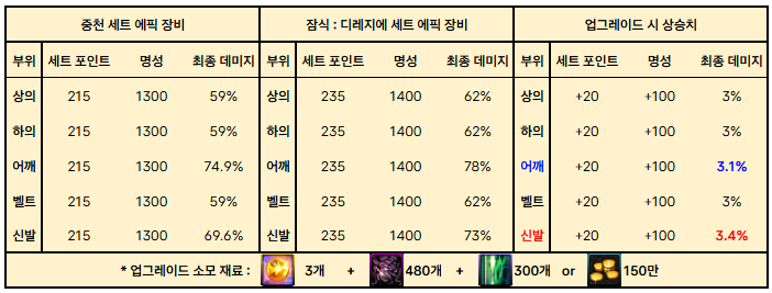 한편, 방어구 업그레이드의 경우 신발 -> 어깨 -> 나머지 3부위 순서대로 업그레이드 하는 것이 효율상으로 좋으며, 융합석 개념이 아니기 때문에 신중하게 업그레이드를 하는 것이 좋겠습니다. 상급던전 고유 에픽 방어구의 업그레이드는 어떤 세트도 가리지 않는다는 장점이 있지만, 낮은 데미지와 조율이 불가능한 단점이 있어 업그레이드가 권장되지는 않습니다.