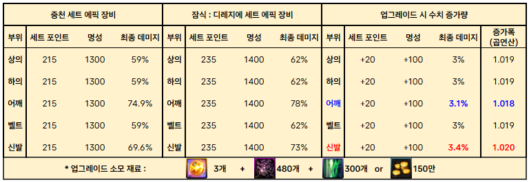 - 그런데, 시뮬레이터 기준 세트 업그레이드 시 신발 -> 상의, 하의, 벨트 -> 어깨 순서대로 상승폭이 높게 찍혔습니다. 아마 API도 그럴 것 같습니다.