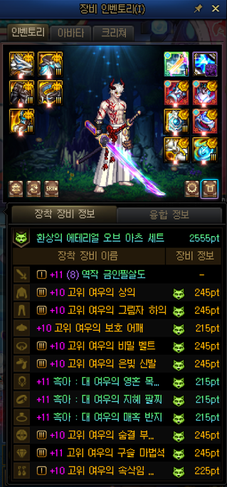 캐릭터 세팅에 필요한 크리쳐 ,  칭호 , 오라 , 마부 , 아바타 ,  태초세트 2550 선 지키며 고유융합석 착용 << 등의 기본적 정보는 다루지 않겠습니다.