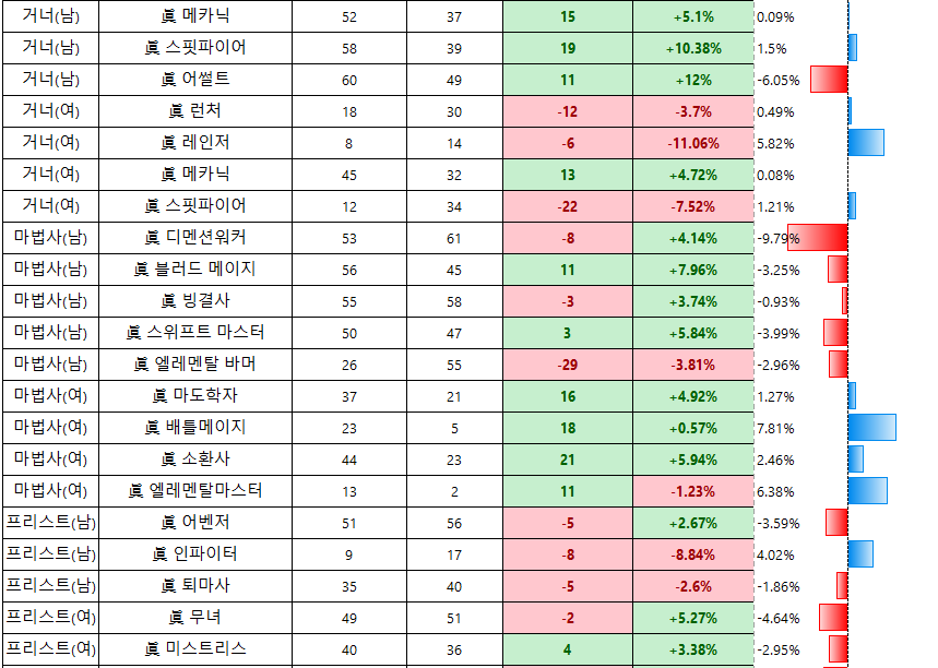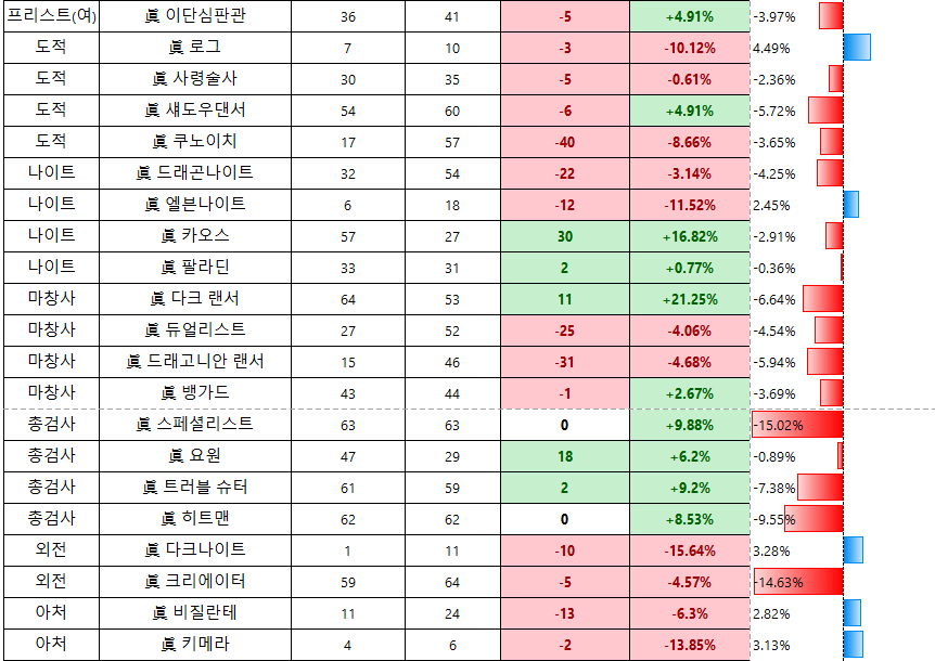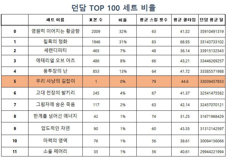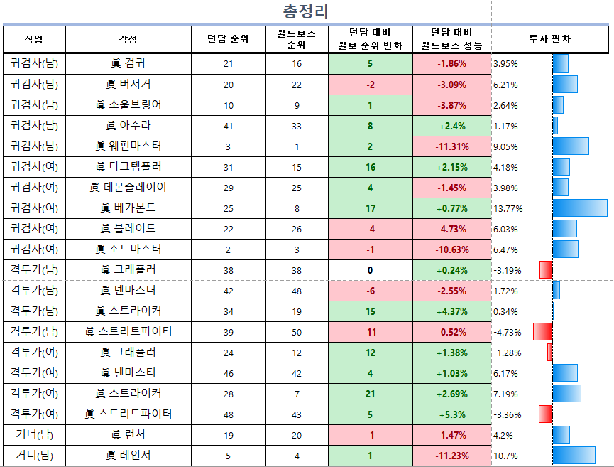 - 목요일 이후 월보 랭커들의 던담 딜 수집, 직업별 전체 인원 수 등 다양한 외적 요소가 반영되지 않아 결과는 참고용으로만 봐주시면 됩니다.