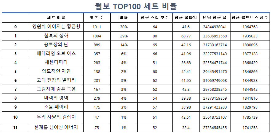 - 월드 보스 점수 TOP100 기준으로, 컨트롤과 딜이 보장된 상위 유저 데이터만을 활용해 분석했습니다