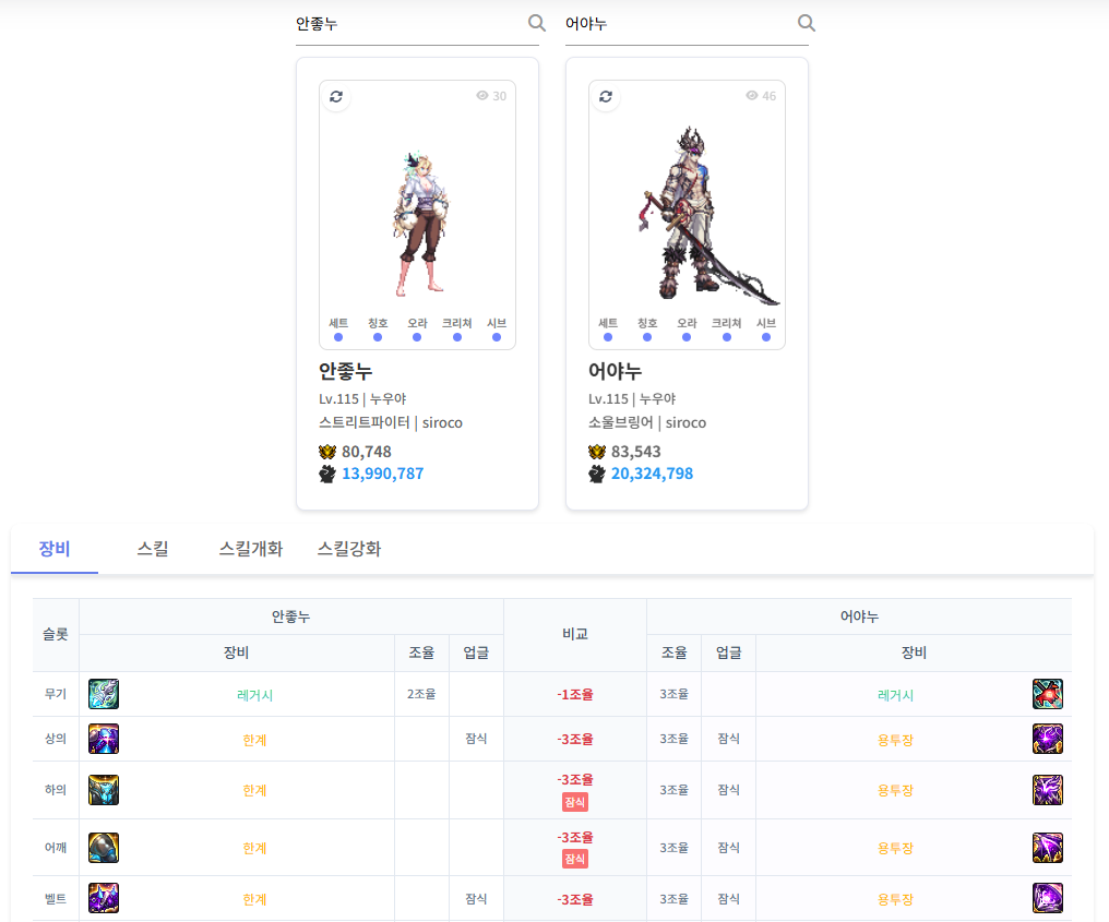 2. 캐릭터 장비 비교