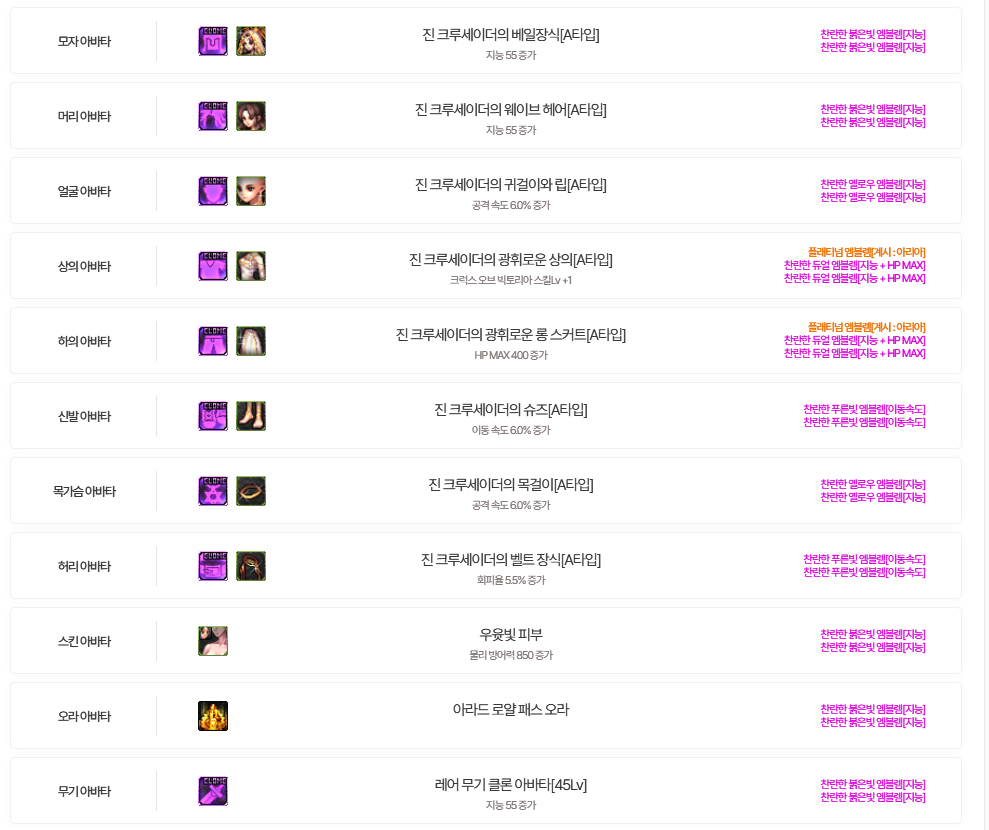 보기 전직 1차 각성 2차 각성 전체 전직 전체 전직 귀검사(남) 웨펀마스터 소울브링어 버서커 아수라 검귀 귀검사(여) 소드마스터 다크템플러 데몬슬레이어 베가본드 블레이드 격투가(남) 남넨마스터 남스트라이커 남스트리트파이터 남그래플러 격투가(여) 여넨마스터 여스트라이커 여스트리트파이터 여그래플러 거너(남) 남레인저 남런처 남메카닉 남스핏파이어 어썰트 거너(여) 여레인저 여런처 여메카닉 여스핏파이어 패러메딕 마법사(남) 엘레멘탈 바머 빙결사 블러드 메이지 스위프트 마스터 디멘션워커 마법사(여) 엘레멘탈 마스터 소환사 배틀메이지 마도학자 인챈트리스 프리스트(남) 남크루세이더 인파이터 퇴마사 어벤저 프리스트(여) 여크루세이더 이단심판관 무녀 미스트리스 도적 로그 사령술사 쿠노이치 섀도우댄서 나이트 엘븐나이트 카오스 팔라딘 드래곤나이트 마창사 뱅가드 듀얼리스트 드래고니안 랜서 다크 랜서 총검사 히트맨 요원 트러블 슈터 스페셜리스트 아처 뮤즈 트래블러 헌터 비질란테 키메라 다크나이트 다크나이트 크리에이터 크리에이터 공통 공통
