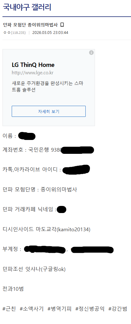 일단 저 개인정보( 이름과 계좌 )는 저 본인이 맞습니다만 작성자는 다른 악의를 품은 신상유포범이며,