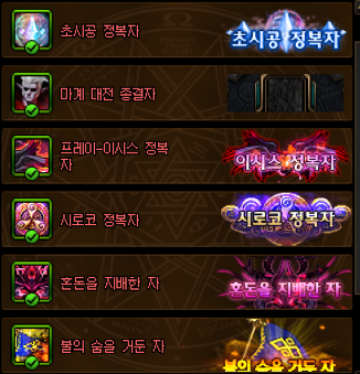 - 레이드 정복자 (핀드워, 프레이, 시로코, 오즈마, 바칼)