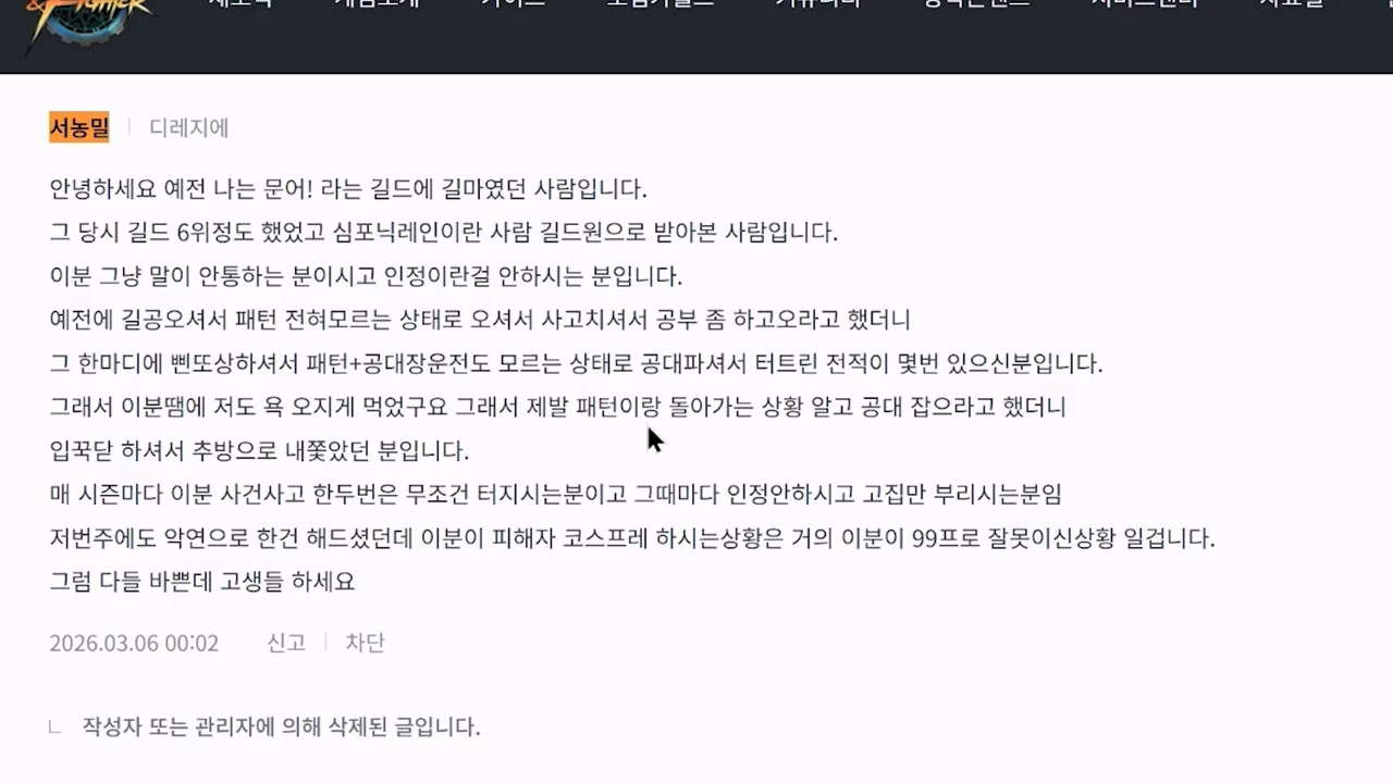 더 웃긴 건 저 댓글에 낚인 것. 사람은 보고 싶은 걸 보고 듣고 싶은 걸 듣는다고 하는데 딱 그꼴나셨습니다. 저는 던파를 하면서 15여년 전 딱 한 번 지인길드에 가입한 것을 제외하면 길드활동이란 걸 해본 적이 없습니다. 던파를 하면서 공대장을 잡은 적이 없다는 건 기록을 잠깐만 검색해보면 전혀 없다는 거 알 수 있을텐데 어처구니 없습니다. 아님 말고 할 거면 공론화 하지 마십시오.