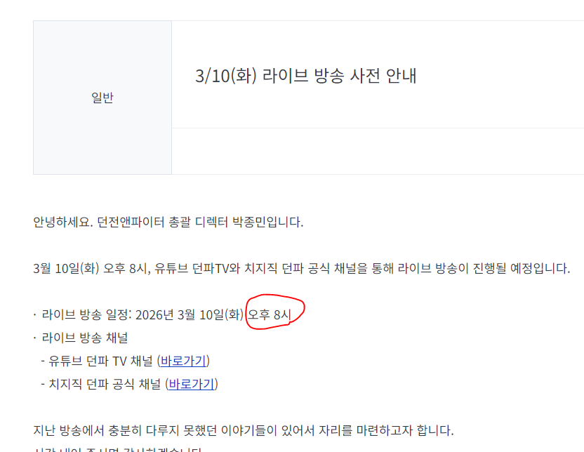 공지 던파로ON : 천해천 발표 요약 던전앤파이터 2026.03.07 7,763 10 공지 [수상자 발표] 내 전직 가이드 작성/갱신 이벤트 수상자 안내 던전앤파이터 2026.03.05 2,481 4 공지 [상시이벤트] 2월 묻고답하기 이벤트 안내 (1월 답변왕 발표) 던전앤파이터 2026.02.12 5,396 2 공지 장비 / 플레이 / 뉴비 정보 모음 (222) 던전앤파이터 2025.04.24 999,999+ 119 공지 던전 공략 모음 (디레지에 레이드) (185) 던전앤파이터 2025.11.26 999,999+ 143 공지 전직 별 가이드 모음 (26/03/03 갱신) (763) 던전앤파이터 2026.02.27 999,999+ 400 토론 [공통] 박종민 디렉터의 적벌적쓰가 말이 안되는이유 (4) 입대 14:40 356 1 토론 [공통] 서약 파밍건....에 대해서 (5) 킹블레이드 14:40 283 0 수다 [공통] 룩압들 가격떨어지네 탈던메타들 시작이신가 ㄷㅅㄷ (8) 예민해 14:36 361 0 수다 [공통] 운영 요즘 너무 잘하네 (3) 냥냥† 14:19 466 2 수다 [공통] 솔직히 내일 방송 (2) 성스러운카레 14:07 294 0 수다 [공통] 낼 부스트업(점핑권)이나 주삼. [Dark]Night 14:03 454 1 수다 [공통] 던전앤라이프도 삭제 들어가나요? (1) ㅣ魔神ㅣ 14:02 649 1 질문 [공통] 님들 베뉴스 재료 나벨재료 어찌되는거 똥인가욯 (8) 카라멜아샷추 13:47 384 2 수다 [공통] 신규친목길드 티백에서 길드원 모집합니다 ★☆단톡/디코/뉴비복귀환영☆★ 악령쿠마 13:40 4,501 1 수다 [공통] 이제 마부에돈쓰지말고 강화증폭이나하죠? (10) 헤카테 13:22 468 0 질문 [공통] 심연계시 (5) 소울을담어 12:51 285 0 수다 [공통] 종민아 들어라 (1) 알파뱃A 12:49 353 2 수다 [공통] 아 제가 자리를 비운사이에 어제몰래 누가 제게정을 침투해서 쿠로스위프트 12:29 384 0 수다 [공통] [멜로디] 연합길드 길드원 모집! 단톡 디코 O / 사람 짱많음! 같이 놀아용 (18) 힉이 12:17 10,339 4 수다 [공통] 와 든쟝들 디레 클수봐 (6) 헤카테 12:10 701 1 수다 [공통] 악연이 컷만되면 어려운 레이드는 아니라고보는데 (10) 탄야 12:05 507 1 수다 [공통] 태초초돌말고 상자로 주지 (1) 로오제 12:00 351 0 팁 [히트맨] 초보자분들을 위한 힛트맨 공략 (57) 패트맨 11:52 96,220 34 질문 [공통] 서약 결정 파밍 (4) 강형욱버린개 11:33 386 2 수다 [공통] 점핑권주세요.. (1) 다라p 11:24 252 1