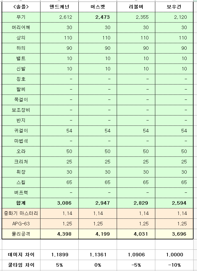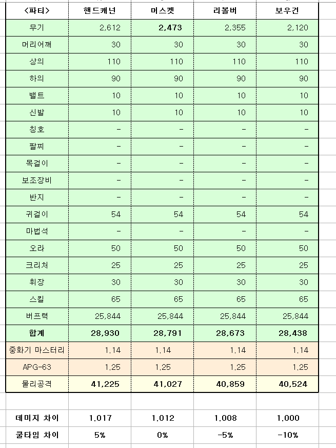 위의 표를 기준으로 설명드릴 때 예전에는 무조건 '보우건'을 권했습니다. 파티플레이시 버프력에 따른 무기별 물공차이가 좁혀지기 때문에 쿨감 -10%를 이득봤기 때문입니다.