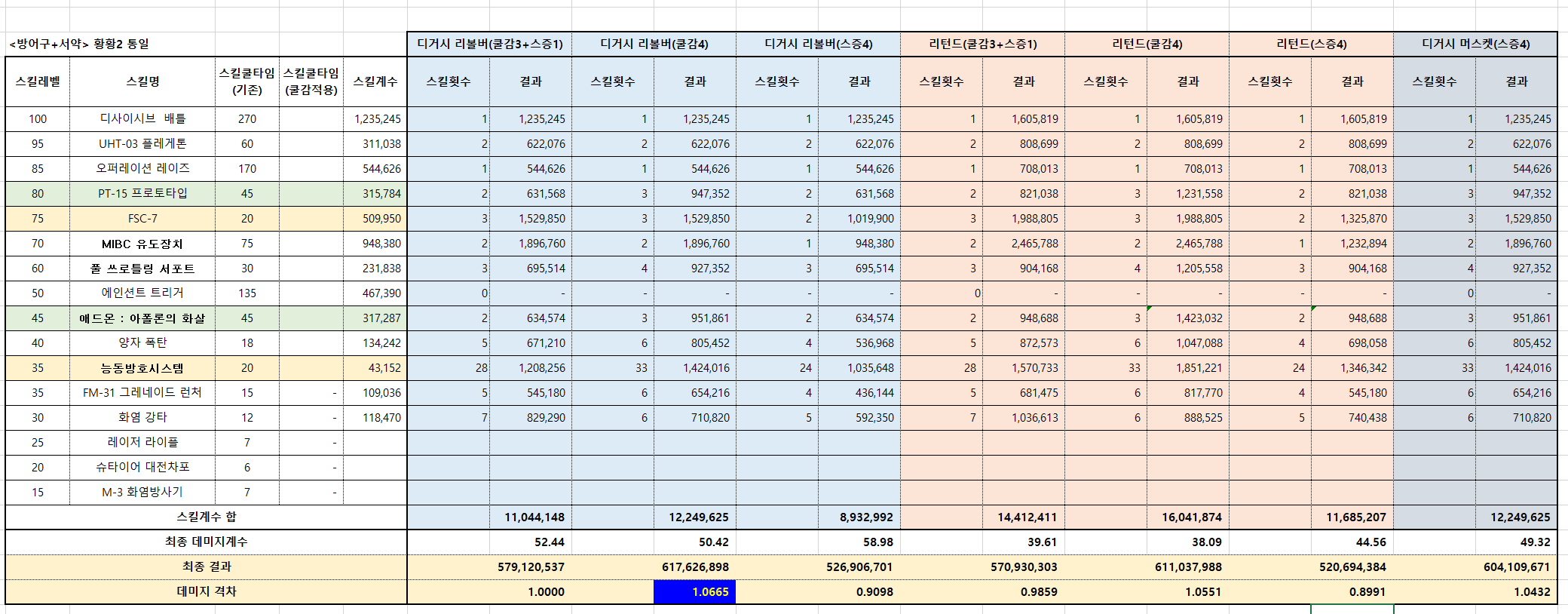 결론2) 황황2 디거시 리볼버 쿨감4 vs 칠칠2 디거시 리볼버 스증4 는 1.1125 즉 11.25%나 차이가 나는 셈. 칠흑유저는 좀 마음에 안 들 상황.