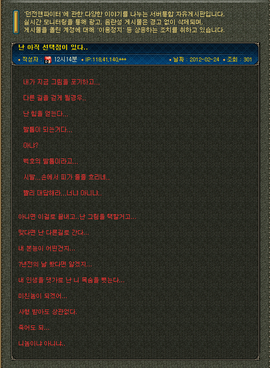 공지 던파로ON : 천해천 발표 요약 던전앤파이터 2026.03.07 16,190 14 공지 [상시이벤트] 3월 묻고답하기 이벤트 안내 (2월 답변왕 발표) 던전앤파이터 2026.03.12 2,872 0 공지 [수상자 발표] 내 전직 가이드 작성/갱신 이벤트 수상자 안내 던전앤파이터 2026.03.05 4,573 5 공지 [이벤트] 천해천 공략 이벤트 (3) 던전앤파이터 2026.03.11 4,108 0 공지 장비 / 플레이 / 뉴비 정보 모음 (223) 던전앤파이터 2025.04.24 999,999+ 120 공지 던전 공략 모음 (디레지에 레이드) (185) 던전앤파이터 2025.11.26 999,999+ 143 공지 전직 별 가이드 모음 (26/03/03 갱신) (764) 던전앤파이터 2026.02.27 999,999+ 400 수다 [공통] 지금 게시판에서 글 쓰는 사람중에 역한 사람 나랑한잔할래 02:11 7 0 수다 [공통] [설렘주의보] 길드원 모집중입니다~ (15) 흔들여신 02:10 12,044 7 팁 [공통] [천해천 던전] 진짜 강력한 파밍 지원이 온다! 역설의 미궁 8분 요약 (2) 영축공장. 02:00 649 1 수다 [공통] 금요일 방송에서 언급되어야 할 것들 (13) [Lilith] 01:45 285 0 수다 [공통] 비난이던 비판이던 본인이 자초 한 일인데 뭘 하라 마라야... (5) 설탕 01:36 220 5 수다 [공통] 근데 박종민이 개못하고있는건 팩트아닌가? (11) 완벽 01:34 186 3 수다 [공통] 아 아크릴 까먹고있었는데 (2) 힉이 01:26 123 0 수다 [공통] 던파를 조지는 개종민은 물러가라 물러가라 아랑대장 01:19 111 3 수다 [공통] [모집] "븜다닥 & 븜다다닥" 길드와 함께 천해천 준비합시다!! <개꿀잼 오픈톡 맛보기 공개> 호북두 01:14 1,156 0 질문 [공통] 디거시 변환상자 질문드립니다 (4) 연유회랑 01:00 159 0 수다 [공통] 소울 전직의 서, 각성의 서 일부 부위 삽니다 Erebus 00:44 96 0 수다 [공통] 진짜 심연좀 불러와줘? (10) 고라임경로당 00:37 321 0 수다 [공통] 이번에도 천해천만 주구장창 이야기할려나 (5) be키니시티 00:25 198 0 수다 [공통] 겨우 이 정도가 심연이라고?? (3) 방패주머니 00:14 329 1 수다 [인챈트리스] 인챈 (4) 냉검 2026.03.18 223 0 수다 [여넨마스터] 와 방송일정 떳다 이번주 금요일~ 뚜따따우따야 2026.03.18 167 0 수다 [공통] 공홈 리뉴얼 이후 게시판이 심연이 될 수 있던가? (8) 캔슬하슈 2026.03.18 330 1 팁 [공통] 차수 레압 이펙트 (7) 강해린 2026.03.18 436 0 수다 [공통] 내일 상던 레기온 철광 초기화 날인데 (3) 아랑대장 2026.03.18 421 0 수다 [공통] 다음주면 모든게 변하겠구만. 백아카리루시 2026.03.18 274 0