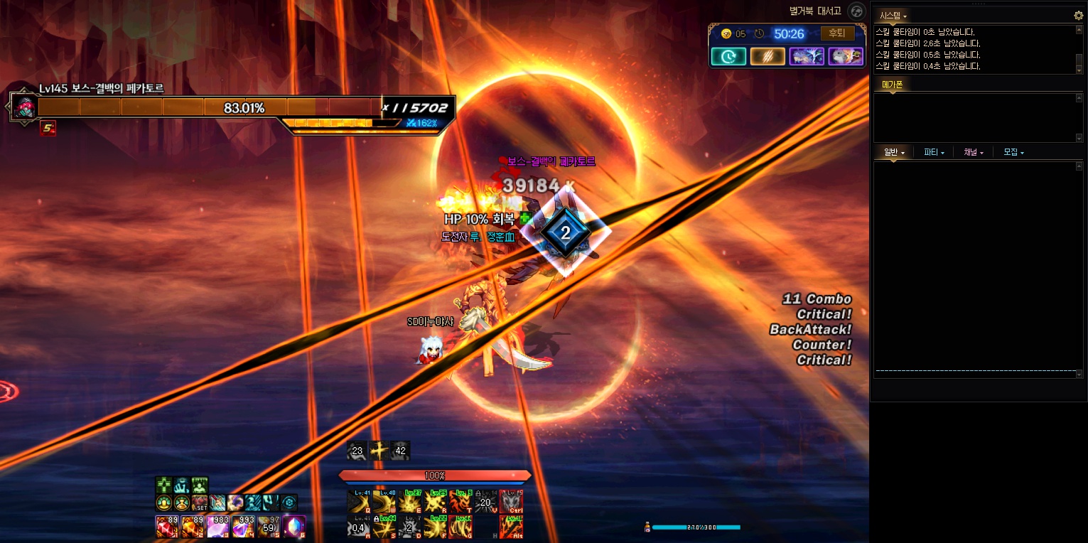 드디어 마지막에 나오는 결백의 페카토르라는 최종보스가 나오는데 1페이즈부터 시작해서진행합니다 어느정도 진행시간되면 필드몹에 대참격이라고 노란원판안에 가서 패턴파훼해야됩니다 그렇게해야 약간씩 페카토르의 무력게이지를깎아내리게되는 이유가생기지요 이패턴은 죽음의여신전에나오는 루브라의패턴이랑 패턴이 비슷한 하위호환격이라고보면됩니다. 그리고 약점보인다는 더빙음성대사하는순간 네모각형 마름모가뜨는데 홀딩스킬2번으로 바로무력화시켜버리면됩니다. 별 어려운건없습니다.