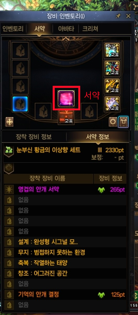 서약 포인트를 올려주는것은 메인장비격인 서약(중앙에 위치한 1개의 슬롯), 그리고 보조 장비격인 결정(서약을 제외한 돌 모양의 11개 슬롯. 기존 융합석 포함.)으로 나뉘어 있음.