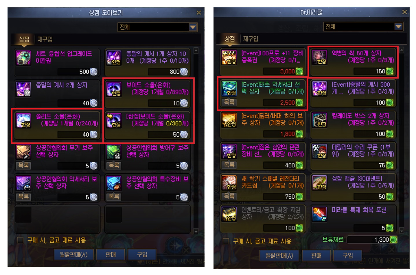 보이드 소울이랑 솔리드 소울이 월간 제한이 있는데 이번 달 지나기 전에 뭔가 사놔야하는거 같음.