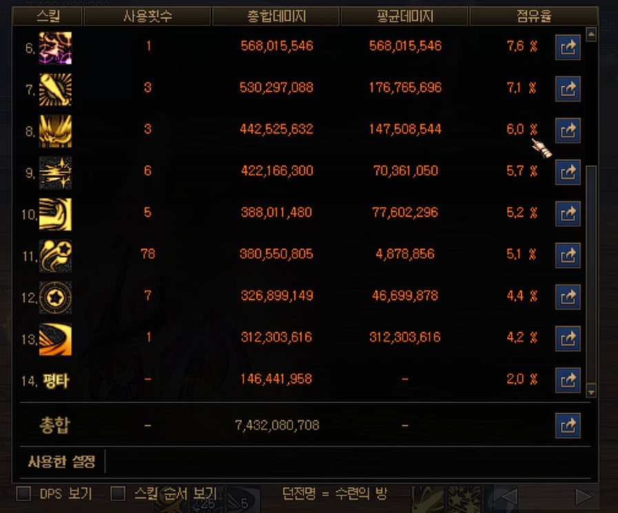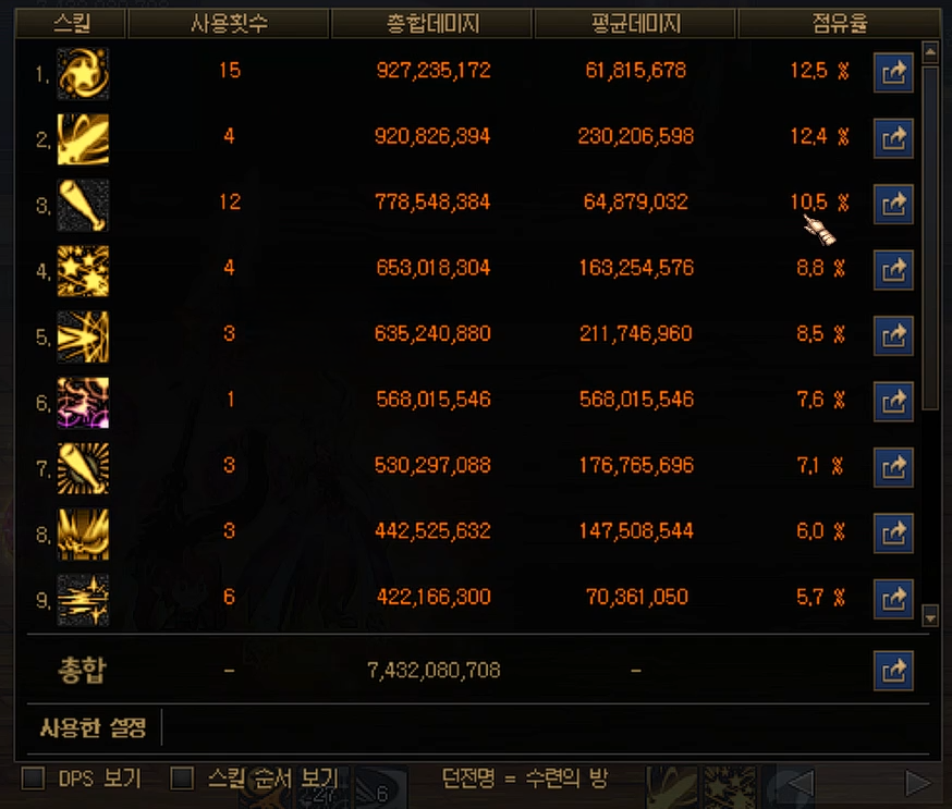 스킬셋팅이 동일한 칠흑 배메 던담이랑 비교하면