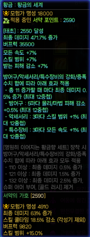 10증 기준 황금향 : 471.7 + (0.5 x 10) = 476.7% / 유틸 (뎀감 범위 속도)