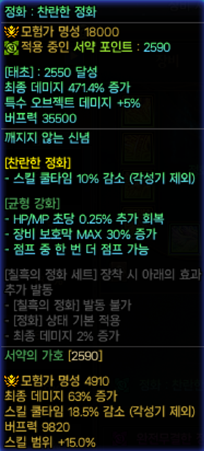 정화 : 471.4% + 오브젝트 데미지 5% + 쿨감 10퍼 / 이단점프