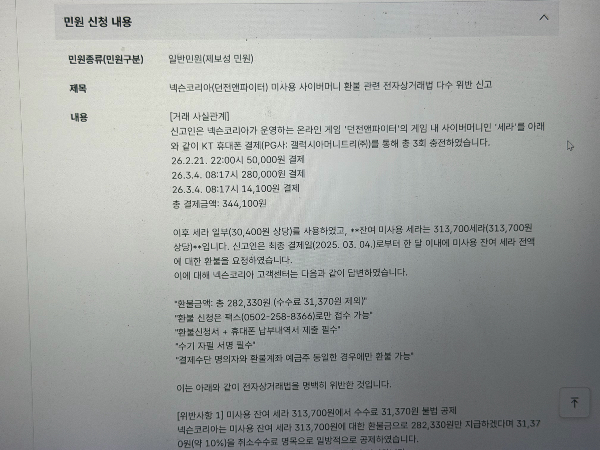 넥슨이 다시 잘 생각해보고 환불 해주기를 바라는데 저 답장도 5일이나 걸려서 너무 속상해요